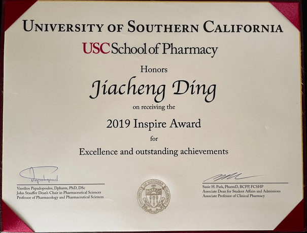 2022-08. Received the USC Mann School of Pharmacy and Pharmaceutical Sciences Interdisciplinary Research Award. Thank you for your support!